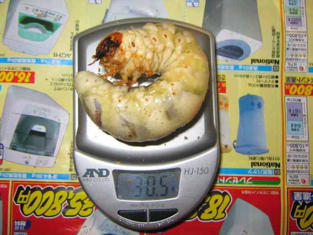 2007年11月この1年振り返った感想を言いますと結果は思ったようにいい数字とはなりませんでしたが楽しくブリードすることができたかな。唯一つ悔やむのがB番村正の蛹体重、体長測定の直後足にカメラのコードが引っかかりなぜかノギスが蛹を直撃してしまいあっ!という間に夢が壊れたこと、その時はまだまだ後がありましたから余裕でしたがそれ以降巨大蛹は出ませんでした。それとF村正です。縮まれば82mm切るでしょうけど今年羽化したなかで一番大きな♂が羽化後5日で死んでしまいました。いろいろ不運なことが有ってテンションが下がりましたが来年に向けて新しく30gUPページを後日立ち上げたいと思います。